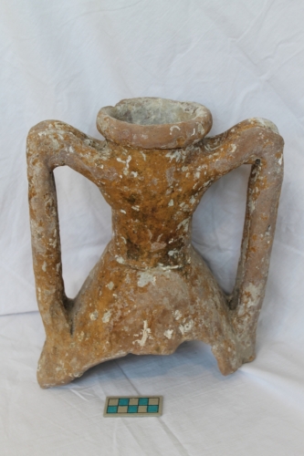 Parte superiore d'anfora con collo cilindrico, corto, nettamente distaccato dalla spalla, molto alta e di forma tronco-conica. Il grosso orlo è ad anello e le anse presentano una sezione a nastro e sono rimontanti.sono a bastoncello conica