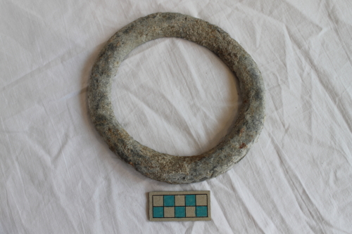 Anello di piombo formato da una verga a sezione irregolarmente circolare. Probabilmente faveva parte dell'attrezzatura di bordo per il fissaggio del sartiame.