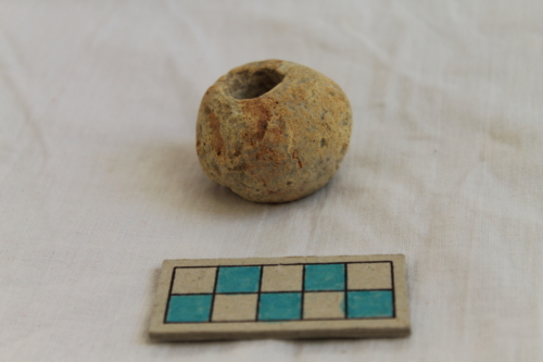 Peso di forma irregolarmente sferoidale, caratterizzato al centro da un foro circolare passante funzionale alla sua sospensione sulla parte inferiore della rete da pesca.