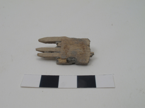Frammento della parte con i denti di un pettine in osso altomedievale. Si tratta della parte con i denti più ampi, a maglia larga. Si nota un foro per l'alloggiamento del rivetto che tiene unito il pettine, ai lati del foro tracce di ruggine del metallo usato come cavicchio. Frammento molto rovinato.