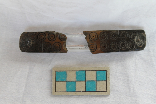 Guancetta in osso di immanicatura, probabilmente di coltello o rasoio. Il reperto presenta una sezione a nastro con la superficie esterna leggermente convessa, che è decorata con una doppia fila parallela di dieci incisioni a "occhio di dado".