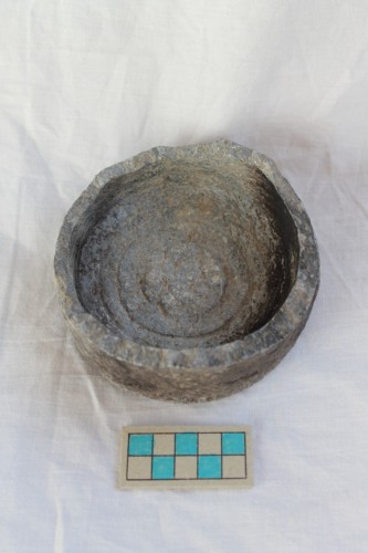 Parte inferiore di una pentola in pietra ollare di colore grigio scuro. Il fondo è convesso, il corpo è cilindrico con pareti verticali. Sono presenti tracce di tornitura sulla superfice interna ed esterna.