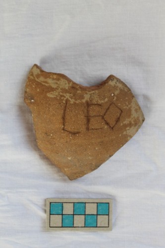 Parete di anfora, appartenente ad una produzione di area egea o del Mediterraneo orientale non meglio definibile. Sulla superficie esterna, dove sono appena evidenti le tracce della lavorazione al tornio, è presente l'iscrizione "LEO" incisa post-cottura..