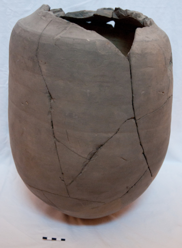 Parte inferiore (corpo) di anfora tipo Lamboglia 2. Il frammento è formato da 16 pezzi restaurati insieme (incollati e integrati nella parte inferiore del corpo). Presenta pareti molto spesse (da 2,2 a 2,7 cm), con una decisa carenatura che segna lo stacco della spalla. L'impasto argilloso, di colore decisamente grigio, presenta qualche mica. Presenta alcuni graffi all'altezza della spalla, probabilmente dovuti all'uso come container di trasporto.