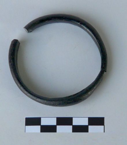bracciale circolare chiuso in vetro nero opaco con sezione a D, irregolare; un tratto è ingrossato e presenza una protuberanza; fattura poco curata