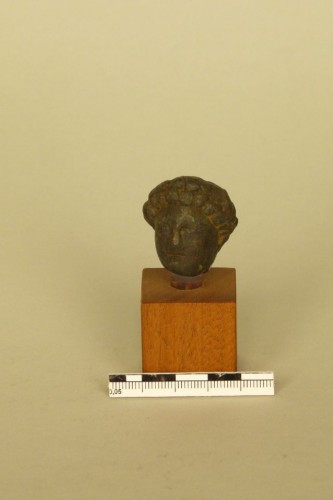 testa frontale con capelli cinti da una corona a cordoncino e disposti in una massa compatta segnata a linee incise sulla calotta cranica e in una serie di riccioli che richiamano dei fiocchi lanosi sulla fronte. Il volto ha tratti regolari, con fronte ampia, orbite infossate con bulbo oculare rilevato e iride incavata, naso schiacciato e bocca socchiusa con labbra sottili.