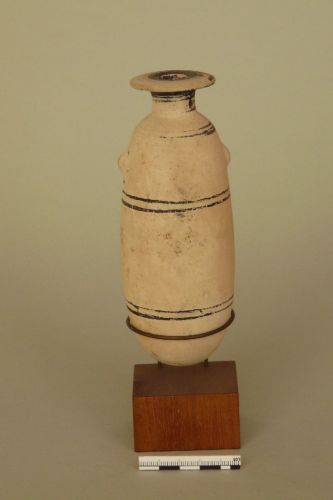 orlo piatto, collo cilindrico, corpo allungato con piccole prese appena sotto la spalla e fondo convesso. Decorazione realizzata con vernice nera opaca che copre interamente orlo, imboccatura e collo ed è stata utilizzata anche per stendere le 3 coppie di linee orizzontali disposte sul corpo a distanza non regolare.