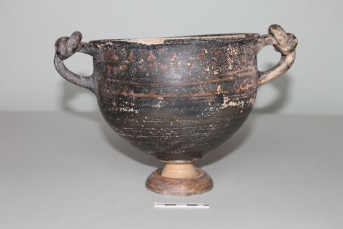 Skyphos apulo dello stile di Gnathia in argilla giallina e vernice bruno opaco. Decorazione in rosso arancio. Il corpo ha vasca profonda e pareti dritte rastremantesi verso il fondo; breve collo esoverso; anse verticali a bastoncello annodate alla sommità; disco di raccordo tra fondo del corpo e stelo, il quale si innesta nel piede ad anello troncoconico. Fondo cavo. Collo del piede e fondo risparmiati. Sul lato A sotto l'orlo: tralcio di foglie di edera e corimbi; segue una fila di puntini tra due linee continue e un motivo ad onda sottolineato da due file di puntini alternate a linee continue. Sul lato B sotto l'orlo motivo ormai illeggibile (gruppi di puntini?) seguito da motivo ad onda, doppia linea di puntini e motivo a catena formata da semicerchi scambiati. Nell'interno del vaso, spirale incisa intorno ad un cerchietto pure inciso. La decorazione è quasi del tutto scomparsa, soprattutto sul lato B. la vernice è in più punti screpolata.L'orlo è sbrecciato. La forma di questo skyphos sembra derivare dai kantharoi acrocorinzi della fine del IV secolo con decorazione fitomorfa simile e anse a nodo erculeo. E' databile al primo quarto del III secolo a.C.