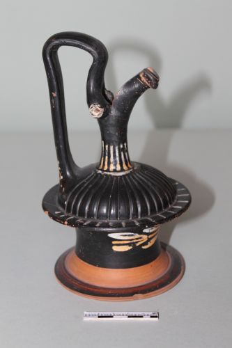 Epichysis apula dello stile di Gnathia in argilla rosata con ingubbiatura arancio e vernice nera brillante. Le decorazioni sono in bianco e giallo. La bocca è a cartoccio, l'ansa alta a doppio gomito con due protomi leonine all'attacco superiore, le spalle rigonfie con bacellatura profonda, separate con un disco dal corpo a profilo concavo, il piede a disco. Il fondo del corpo e il piede sono risparmiati. Le protomi leonine sono ricoperte di bianco; all'attacco inferiore dell'ansa, vi è una palmetta aperta con girali in bianco e giallo, sul collo, falsa baccellatura in bianco. Sul disco superiore, raggiera di trattini in bianco. Sul corpo, corona di foglie di alloro verso sinistra in bianco e giallo. Alcune piccole screpolature all'orlo del disco superiore e del piede. E' databile ai primi decenni del III secolo a.C.