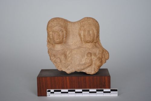 Delle due figure rimangono i busti. Sono sedute su un trono ad alta spalliera. Vestono chitone e himation. Hanno il polos in testa. I volti sono rotondeggianti; i capelli sono suddivisi in due bande ondulate. La figura di destra tiene con la mano destra forse un frutto e con la sinistra forse un'insegna. L'altra figura regge in grembo un volatile (colomba?). Terracotta nocciola chiaro.