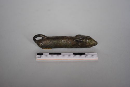 Pendaglio a forma di animale accucciato. Il muso riposa tra le zampe anteriori mentre quelle posteriori sono piegate sotto il corpo. La testa ha orecchie allungate protese verso il retro. Gli occhi hanno iride incavata; la bocca è resa con un solco. La coda è saldata alla schiena formando un anello (di sospensione?). Sul collo il pelo è reso a ciuffi ondulati, sulla schiena da un motivo a spina di pesce.
