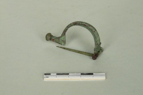 testa rettangolare ripiegata verso lesterno a formare la cerniera, dotata di perno in ferro originariamente fermato alle due estremità da pomelli semicircolari di cui solo uno si è conservato. La testa, forata alle estremità, laterali è caratterizzata dalla presenza di una doppia modanatura in rilievo nella parte orizzontale inferiore e superiore; probabilmente poteva essere decorata da occhi di dado, ma le ossidazioni superficiali non ne permettono una lettura ottimale. Larco semicircolare rilevato, ha una sezione triangolare ed è ornato, lungo l'asse mediano, da una modanatura centrale decorata da linee trasversali parallele incise tra due modanature laterali, mentre lungo i bordi è segnato da due modanature in rilievo. La staffa piena è chiusa all'apice da un bottone circolare modanato, mentre l'ardiglione ha una sezione quadrangolare irregolare.