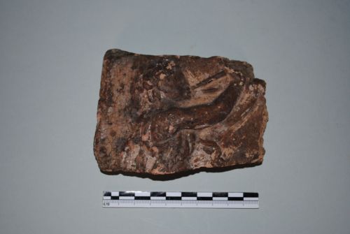 Lastra consunta con busto a rilievo di un suonatore di siringa rivolto a destra. La siringa è impugnata dalla mano destra. La testa ha capelli a ciocche ondulate con frangia sulla fronte. Indossa una tunica e un mantello avvolto sulla spalla sinistra e ricadente sulla schiena. Terracotta bruno grigiastra.