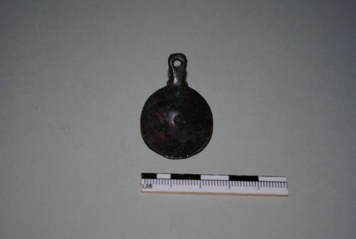 Pendaglio a forma di capsella formata da due valve mammelliformi saldate, con appendice rettangolare dotata di foro passante circolare.