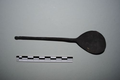 Cucchiaio con conca di forma ovale deformata. Manico a sezione poligonale terminante in due globetti e una pigna consunta.
