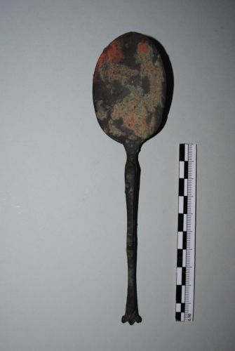 Cucchiaio a conca ovale profonda. Manico leggermente angolato, a sezione rettangolare, terminante in una zampa a tre artigli.