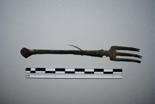 Forchetta a tre rebbi su base rettangolare. Manico angolato a sezione circolare, terminante in uno zoccolo.