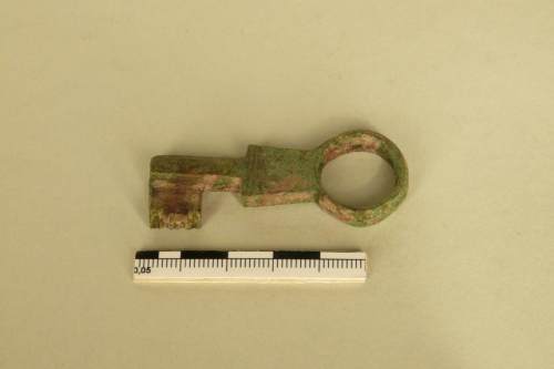 - NOTIZIE STORICO CRITICHE faceva parte di un sistema con chiave a scorrimento con la stanghetta di serratura fermata da asticciole verticali (pessuli). Questo sistema è il più diffuso in età romana per porte, armadi, scrigni e altre serrature simili. La proposta di una datazione nella piena età imperiale deriva dal fatto che l'esemplare sembra un'evoluzione dei più antichi modelli in ferro, dei quali però mantiene un robusto fermo-corsa