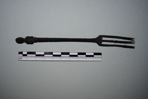 Forchetta a tre rebbi innestati su una base stondata. Manico a sezione poligonale, terminante in due modanature e una pigna.