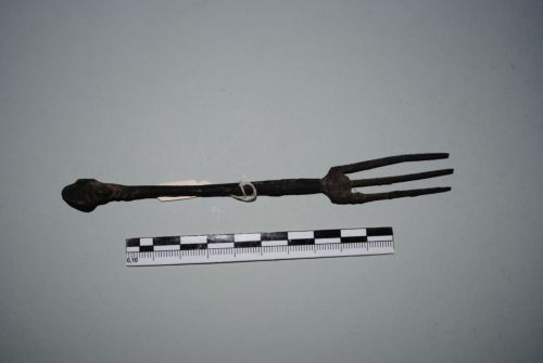 Forchetta a tre rebbi su base rettangolare. Manico a sezione circolare, terminante in uno zoccolo.