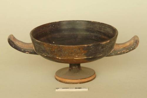 alto orlo distinto dal corpo, vasca poco profonda che si inserisce a curva continua nel medio stelo; anse orizzontali a bastoncello rialzate; piede a disco dal profilo lievemente concavo con interno cavo. A risparmio: pannello e interno delle anse, sottile linea sul piede e orlo del medesimo; piano d'appoggio del piede e inizio della cavità dello stelo