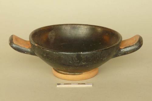 vasca larga e profonda, profilo delle pareti a curva continua, anse a bastoncello rialzate impostate poco sotto l'orlo, piede a tondello. A risparmio, interno delle anse e piede