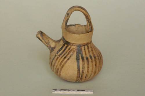 thelastron (o side-spouted necked jug) corpo arrotondato con orlo diritto e ansa a cestello; beccuccio laterale; apode; decorazione a strisce irregolari sull'ansa e sul beccuccio; sul corpo fasci di linee parallele disposti diagonalmente