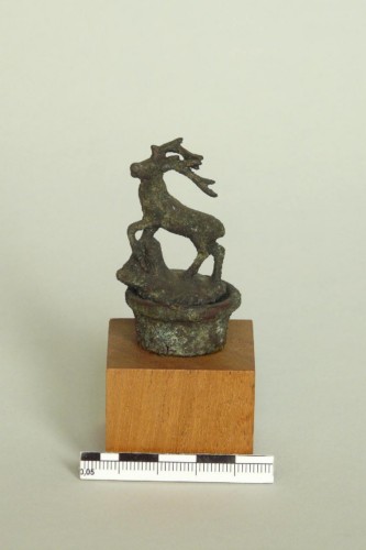 - NOTIZIE STORICO CRITICHE in Tombolani 1981 il coperchio è attribuito al kyathos inv. 1971, interpretato come calamaio. L'oggetto sembra comunque composto di due parti separate, un coperchietto in origine cilindrico, deformato per adattarlo alla statuetta del cervo sulla roccia. La statuetta del cervo richiama motivi pastorali e venatori della piena età moderna