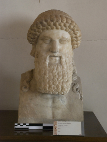 Erma con testa maschile, caratterizzata da un volto largo incorniciato da una triplice corona di riccioli chioccioliformi fermati da una tenia sottile che gira tutt'intorno al capo, con lunghe ciocche che ricadono ondulate posteriormente, a eccezione di due grosse trecce che scendono dietro le orecchie e si appoggiano sul davanti; una fluente e abbondante barba di forma quasi rettangolare, costituita da lunghe ciocche dalla punta arricciata, disposte apparentemente senza ordine e incise leggermente da linee superficiali. La bocca è leggermente dischiusa, con le labbra ben delineate; gli occhi, lunghi e con gli angoli leggermente rivolti verso il basso, presentano le palpebre ben delineate e l'arcata sopraccigliare molto allungata.