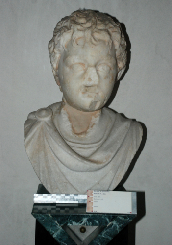 - NOTIZIE STORICO CRITICHE E' probabile che in questa testa di fanciullo si debba riconoscere il giovane Caracalla o il volto di un giovane ignoto che avrebbe volutamente accentuato la propria somiglianza con il primogenito della dinastia dei Severi. A rendere difficile l'interpretazione sono i pesanti interventi di restauro cui il ritratto è stato sottoposto, avendone potuto alterare le fattezze originarie. Il busto è moderno.