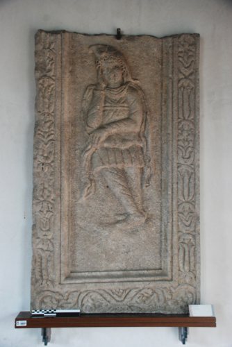 Lastra riquadrata da una semplice gola rovescia, seguita da una cornice ornata con una decorazione fitomorfa, mentre nel campo è raffigurato Attis, il pastorello frigio con pileus, breve tunica, brache e corta mantella, con le gambe incrociate in posizione di riposo.
