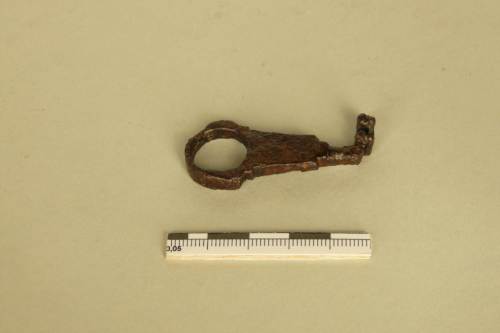 anello circolare con riseghe laterali, stelo trapezoidale (che funge da fermo-corsa), fusto a sezione rettangolare desinente ad angolo retto per far luogo all'ingegno con barba a due denti