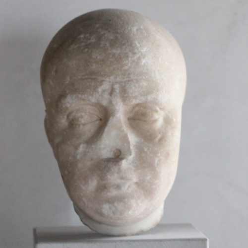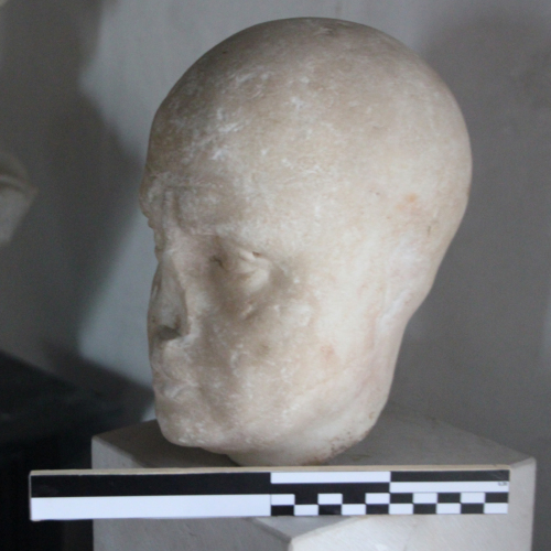 La testa, dall'ovale allungato, è caratterizzata dal cranio liscio, rasato con una incisione a T sulla nuca. L'ampia fronte è solcata da lievi rughe ed pienamente investita dalla luce, arcate soppraccigliari pronfonde e palpebre socchiuse ombreggiano invece lo sguardo intenso, ma sereno. Il naso è abraso, mentre si leggono bene le labbra carnose, piegate in un morbido sorriso appena accennato. Le orecchie sono minute, appena percepibili ai lati del volto.