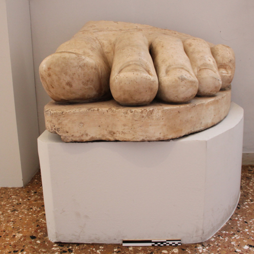 Dell'intera scultura, che doveva avere dimensioni davvero colossali, si conserva solo il piede sinistro e parte del sandalo, che funge da base d'appoggio della scultura. I finimenti della calzatura dovevano essere stati realizzati in un diverso materiale: pur non essendo più presenti, se ne conserva traccia nei fori per il fissaggio dei perni che li tenevano legati al piede.