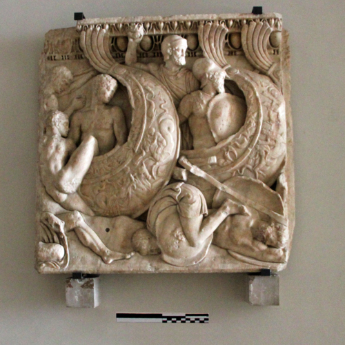 Il rilievo ha forma quasi quadrangolare. I bordi sono regolari, diritti. Al di sotto di una cornice a tre filari, due più piccoli ed uno più grande costituito da ovoli, si trova una scena di battaglia con le navi. Essa si divide in due registri: quello più alto in cui i soldati sono tutti raffigurati rivolti verso sinistra, mentre lottano con vigore contro il nemico, quello più basso in cui stanno, avvolti nel silenzio i morti della battaglia. Si individuano tre navi: la prima solo per la presenza del pennacchio terminale, le altre sono descritte con dovizia di dettagli: le loro chiglie sono istoriate con elementi che richiamano il mondo del mare, tra cui eroti e nereidi su cavalli e tori marini. Sull'imbarcazione più a sinistra, dal punto di vista della narrazione, stanno guerrieri armati di elmi e scudi circolari, a destra invece i soldati sono ritratti in nudità eroica. Uno di loro è colto nell'istante in cui tenta di risalire sulla nave.