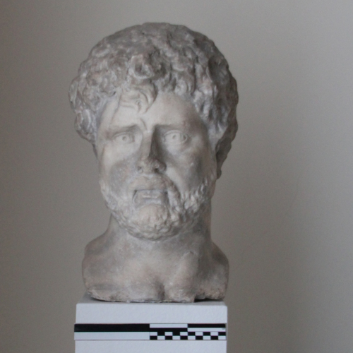 La testa appartiene a un erma a protome maschile. L'uomo, ritratto in età matura, ha volto dall'ovale allungato, in cui la struttura ossea sottostante è marcata: arcate soppraccigliari e zigomi sono sporgenti, profondo è anche l'incavo alla base del collo, dove si congiungono le clavicole. La fronte è stretta, in parte coperta da un ricciolo della capigliatura: scende a tenaglia, fino a lambire l'attaccatura del naso dalla forma aquilina, esito di un restauro moderno. L'espressione seria, meravigliata, è conferita dai grandi occhi dalla forma arrodondata e dalla pupilla incisa, resa mediante un solco ampio dal profilo arrotondato. La bocca ha labbra sottili, coperte da una fitta barba che scende in boccoli sul mento. L'acconciatura è costituita da capelli folti, solo parziamente rifiniti: nella parte in prossimità del viso, essi sono lavorati in riccioli dalla forma rotonda, mentre avvicinandosi alla nuca, essi divengono sempre più stilizzati, per essere solo abbozzati in sommità.