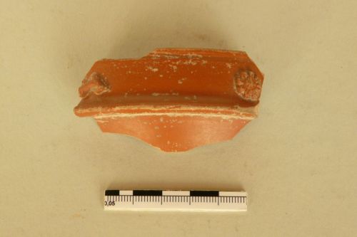 frammento di orlo con decorazione a coda di delfino e rosetta a otto petali