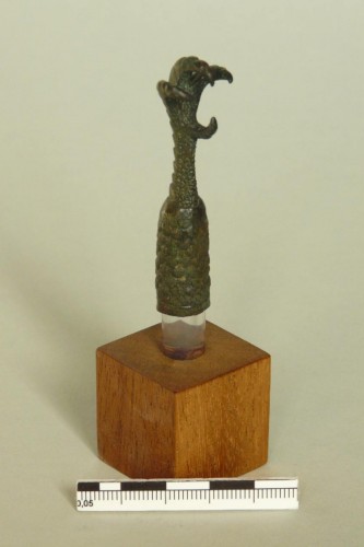 terminazione di impugnatura cava configurata ad artiglio di rapace caratterizzato da una decorazione a squame che deve richiamare il piumaggio dell'uccello; l'artiglio è aperto come a ghermire una preda