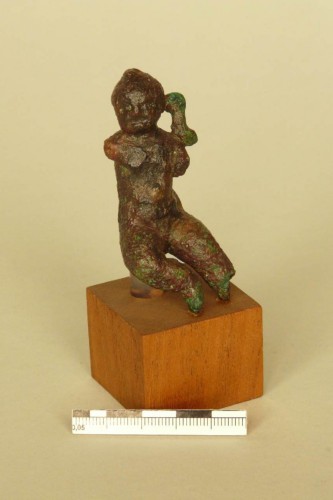 figurina di fanciullo nudo, seduto sulla gamba destra ripiegata, mentre la sinistra, leggermente flessa, doveva essere appoggiata a terra con il piede. Le braccia del fanciullo dovevano essere protese in avanti per stringere uno o più serpenti, di cui resta un frammento delle spire sulla spalla sinistra del piccolo Ercole