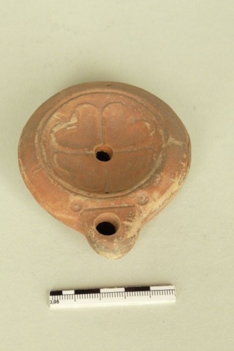Lucerna in argilla rosso bruno a becco corto e rotondo, separato dal disco da una linea orizzontale che termina in due circoletti umbilicati (tipo Loeschcke VIII, L1); un rosone a quattro grandi petali bilobati circonda il foro di alimentazione. Sul fondo punzonatura rotonda.