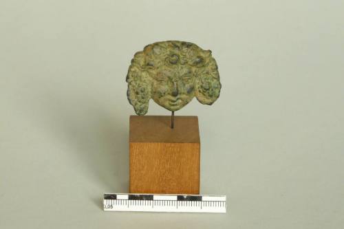 testina femminile con scriminatura centrale che divide i capelli ricci in due grosse bande raccolte ai lati del volto e ornate da grappoli d'uva; il viso è caratterizzato da folte sopracciglia, occhi con palpebre rilevate, grosso naso e bocca atteggiata a smorfia