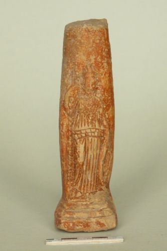 supporto di lucerna decorato con una figura femminile in rilievo: Minerva stante sulla sinistra con la gamba destra leggermente flessa e scostata, che indossa il chitone ed ha il petto coperto dall'egida a squame; tiene con la mano sinistra lo scudo e con la destra la lancia; sul capo indossa l'elmo corinzio (?) con alto lophos.