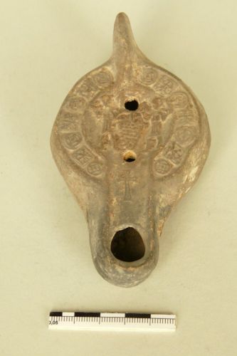 serbatoio rotondo, becco a canale allungato, ben distinto dal corpo e con tracce di riduzione, ansa piena e triangolare che divide la decorazione di spalla in due fasce racchiuse tra due piccoli bordi, ciascuna con quattro croci monogrammatiche che si alternano a quattro losanghe. Sul disco, piccolo e concavo, a due infundibula, sono rappresentati due putti che portano un grappolo d'uva. Il fondo, ad anello rilevato, è collegato all'ansa da una nervatura in rilievo. Argilla bruna.