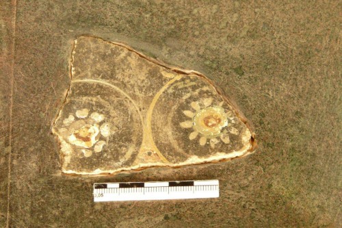 frammento a fondo nero con due cerchi tangenti gialli che racchiudono due fiori: uno con petali cuoriformi bianchi e bottone giallo e rosso, l'altro con petali gialli e bottone a cerchi concentrici azzurro, giallo, rosso.