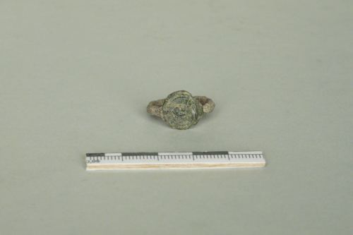 verga circolare in stagno con castone piatto circolare sul quale è saldata una moneta probabilmente di IV/V secolo, con testa forse radiata