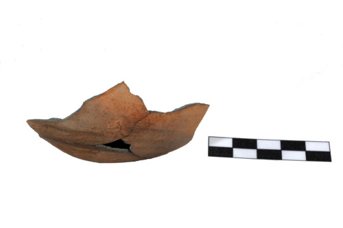 Scarto di produzione di bicchiere con fondo piatto e corpo ovoidale. L'argilla è all'interno di colore grigio scura, all'esterno arancio, mal cotta.