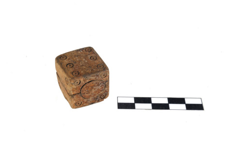 Dado cubico costituito da vari pezzi disposti attorno ad un cilindro centrale, su ciascuna faccia è segnato il num. da 1 a 6 formato da occhi di dado incisi.