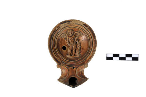 Lucerna a volute a bottone, serbatoio troncoconico, spalla degradante verso il disco con tre profonde solcature concentriche tra la spalla e linizio del disco, becco largo terminante ad angolo ottuso, piede a disco sottolineato da profonda solcatura circolare, disco a pareti concave, decorato dalla figura stante, di prospetto, di un Erote, come Ercole, ad ali spiegate, nudo, tiene nella mano s. la clava e dal braccio s. scende la leontè, probabilmente è raffigurato nell'atto di urinare. Il foro di alimentazione è decentrato, sul lato s., quello di sfiato si trova sullattacco tra becco e spalla, in asse con il foro di bruciatura, allestemità del becco. Tracce d'uso alla punta del becco. L'argilla è di colore nocciola, la vernice è rosso-bruna distribuita irregolarmente.
