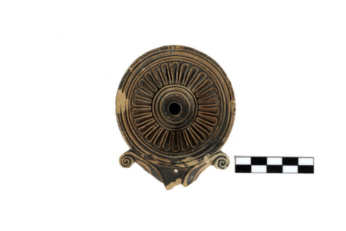 Lucerna a volute, serbatoio troncoconico, spalla inclinata verso linterno con tre solcature concentriche, incise e tre cordoli in rilievo, il disco fortemente concavo è decorato da 26 baccellature disposte attorno allinfindibulum centrale limitato da una fascia a tre anelli rilevati, volute plastiche aggettanti e desinenti a ricciolo, becco angolare. Foro di sfiato al centro del becco, in asse con il foro di alimentazione. L'argilla è di colore camoscio, la vernice è bruna molto scura e diluita.