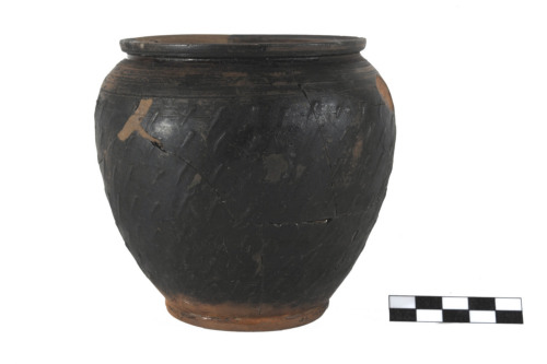 Boccale con orlo ingrossato, estroflesso, concavo allinterno e stretta gola esterna allattacco con la spalla, quest'ultima decorata con sottili linee orizzontali concentriche incise, corpo ovoidale decorato da sottili spine oblique a barbottina, piede ad anello. L'argilla è di colore nocciola scuro, l'ingobbio è bruno scuro con chiazze grigiastre, piede privo di ingobbio.